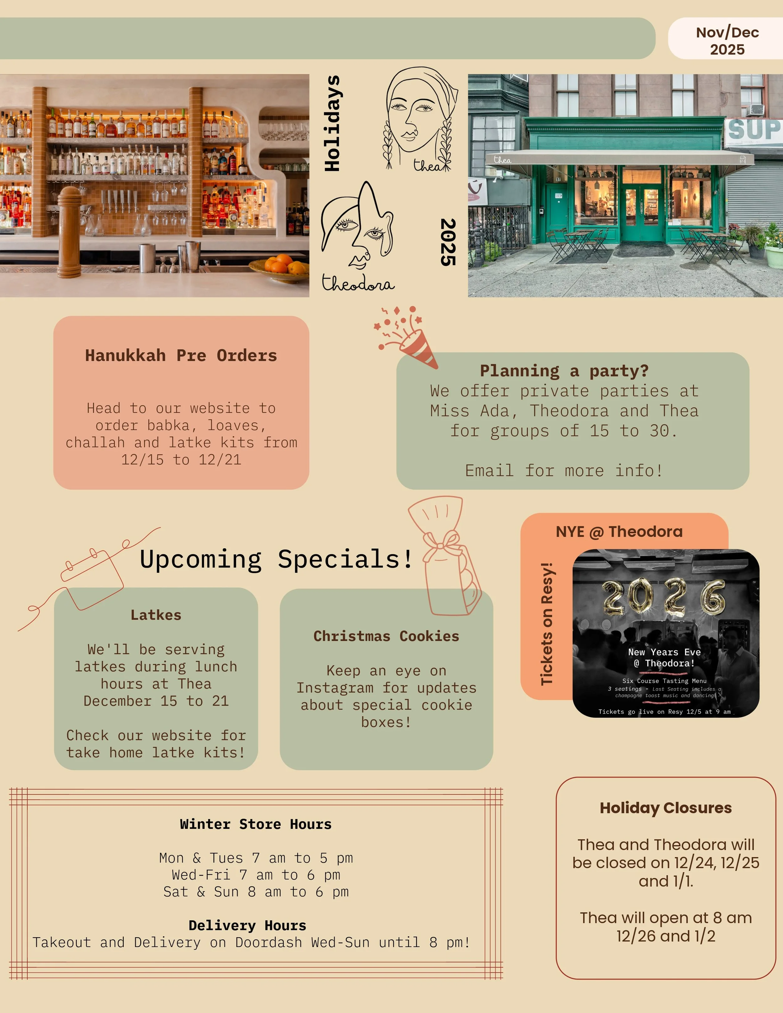 Looking for a space for your next party? At Thea we offer events for 15 to 100 people. We host offsite events for Theodora and Miss Ada and offer family style menus from both spaces. There is no space fee, and pricing is based on a Food and Beverage minimum.